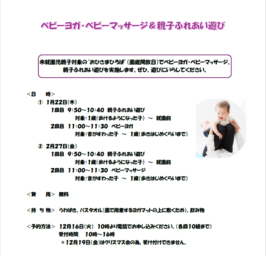 🌸おひさまひろばでベビーヨガ・ベビーマッサージ&親子体操を行います。ぜひご参加ください。