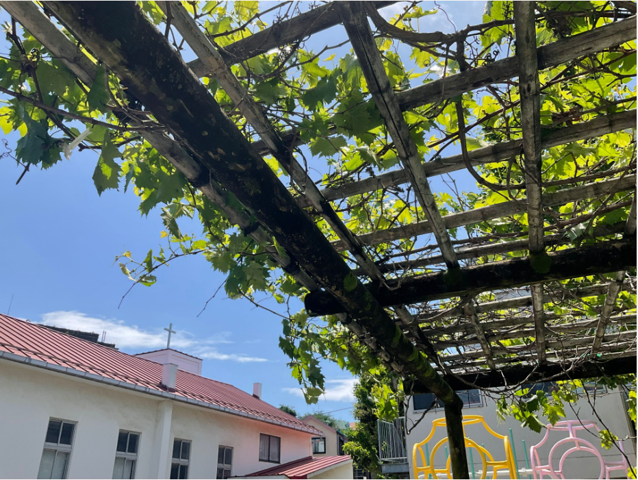 園庭のぶどう棚もすこし前まで茶色の枝だけだったはずなのに